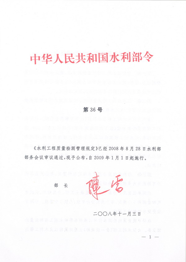 水利工程质量检测管理规定(水利部令第36号)