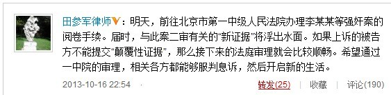 10月16日22点54分,李某某案受害人律师通过微博透露,此案将于17日阅卷,并质疑新的证词,微博称:“明天,前往北京市第一中级人民法院办理李某某等强奸案的阅卷手续。届时,与此案二审有关的‘新证据’将浮出水面。如果上诉的被告方不能提交‘颠覆性证据’,那么接下来的法庭审理就会比较顺畅。希望通过一中院的审理,相关各方都能够服判息诉,然后开启新的生活。”