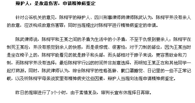 针对公诉机关的意见,陈柯宇的辩护人、四川刑事律师网律师陈武认为,陈柯宇并没有杀人的故意,应该构成故意伤害罪;同时当庭提出对陈柯宇进行精神病鉴定的申请。