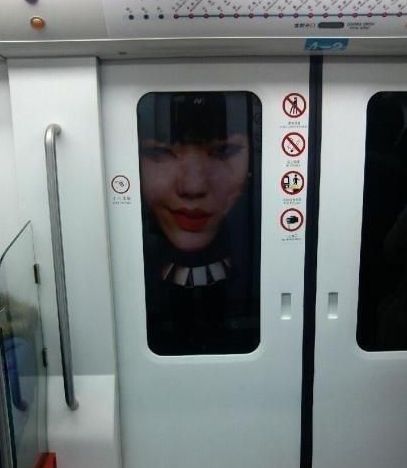 ????广告中,有吴莫愁大幅脸部特写照片,烈焰红唇极其夸张,双眼半睁半闭、左右大小不一、画着浓黑眼影。据悉,在珠江新城等多个地铁站也有此广告。此外,日前网友“尹卓男”在微博中也称“吴莫愁惊现于沈阳地铁门上,吓了乘客一跳”(如图)。