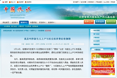 修水县委县政府站昨日消息,叫停新生儿上户与社会抚养费征收捆绑。网络截图