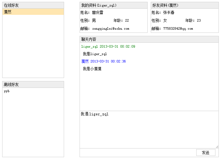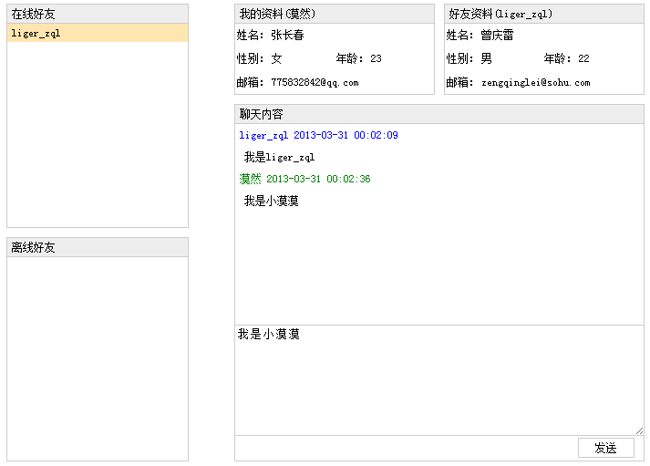 登录成功后,两选项卡分别跳转到如下界面:双击在线好友中的行,则可开始进行聊天。