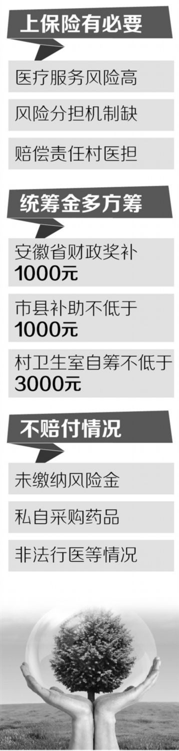 近日,安徽省卫计委、省财政厅联合下发《关于建立村卫生室医疗执业风险分担统筹资金的意见》,决定按每个村卫生室筹资不低于5000元的标准,建立村卫生室医疗执业风险分担统筹资金,由省、市(县)、个人出资,县级统筹,专项用于村卫生室发生医患纠纷时的医疗赔偿。