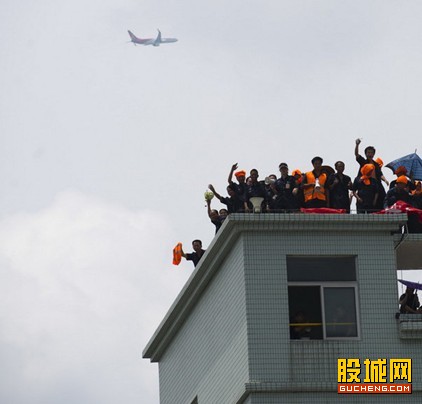 近日,深圳市沙井街道崇光电器制品厂楼顶四十多位保安已经在楼顶守了两天并扬言跳楼。起因是原保安不满工厂加强厂内保安力量,要求解除劳动合同并要求一年工龄补偿两个月经济补偿金,双方未能达成共识。图为四十多位保安陆续爬上女工宿舍六楼楼顶扬言要跳楼,要求厂方答应他们的补偿条件。