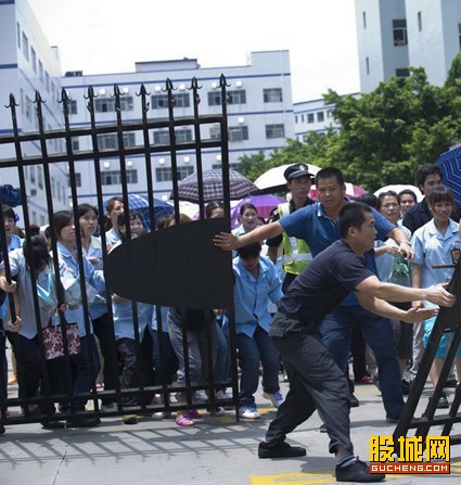 眼看四十多位保安在楼顶要跳楼,工厂拒绝记者进入现场,数百位愤怒的工人齐力把工厂铁门推倒。