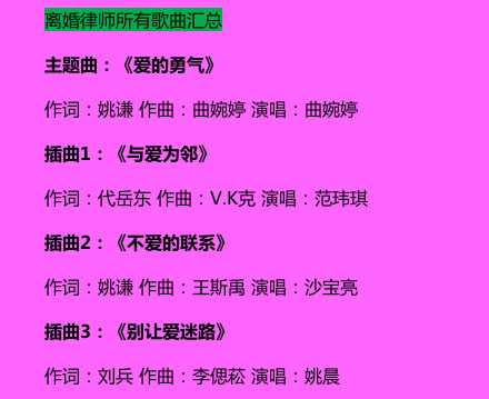 当男律师遇上女律师,当郭芙蓉姚晨遇上萌大叔吴秀波,一出好戏就要开演啦。《离婚律师》是姚晨产后复出主演的首部电视剧,此次姚晨携手人见人爱的大叔吴秀波一起上演一部欢天喜地哭笑不得的“争辩大赛”,剧中姚晨处处与吴秀波为敌,好男人吴秀波则处处忍让,让电视剧《离婚律师》看点多多的,有很多人也特别喜欢剧中的一些插曲,主题曲,以及片尾曲,下面,就是小编为大家深扒出来的各种主题曲插曲,希望大家喜欢哦。剧中的歌曲有《爱的勇气》,《不爱的练习》,《别让爱迷路》,《与爱为邻》