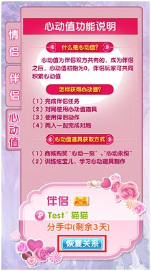 在分手期内,两人和解以后想复合的话也很简单的,主动提出分手人可以选择恢复关系,一切情侣相关(例如心动值)均不会受影响(被分手的一方无法选择恢复关系)。选择恢复关系后,之前消耗的伴侣解除书不会归还。如果在分手期内没有点击恢复关系,分手期结束会解除伴侣关系,双方同时恢复单身。离婚后,曾经的伴侣会出现在伴侣记录里。