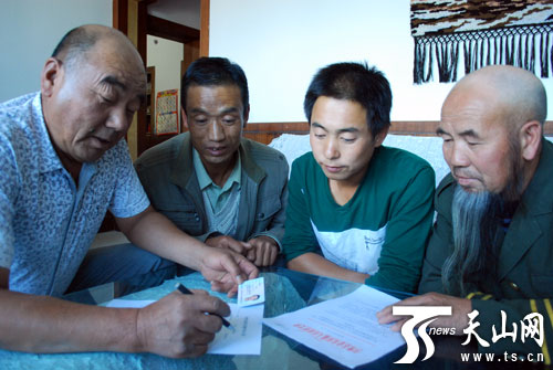 沙河子村村干部(左一)给棉农(右一)与拾花工(中间两位)讲解签订劳务合同事宜