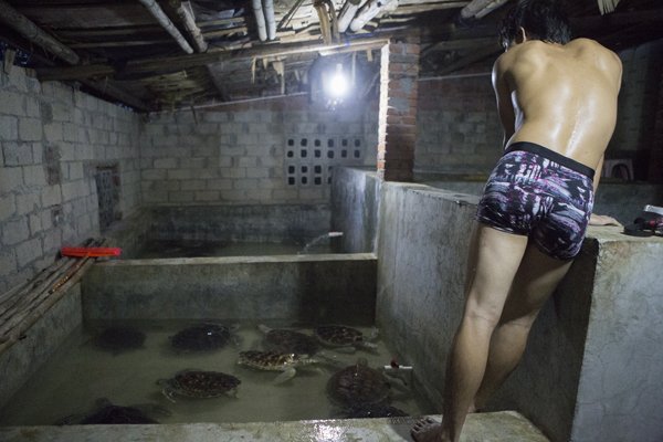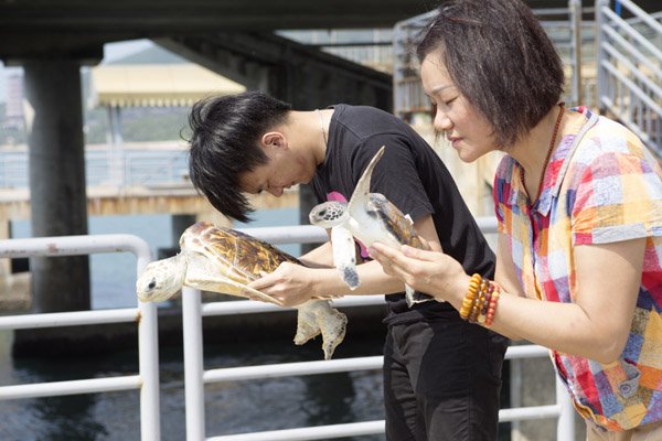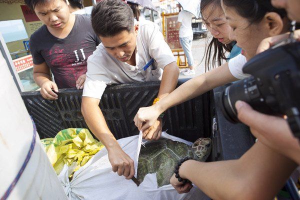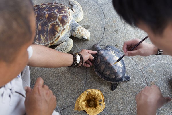 娄先生用金漆在两只准备放生的海龟的背上写上了自己和家人的名字。据说这样可以得到保佑。