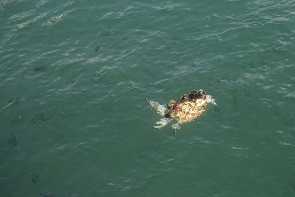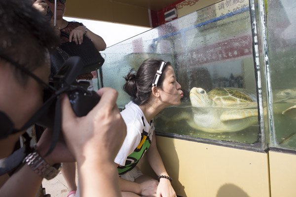 背上写了金字的海龟在海水中磷光闪闪,周围的游人纷纷赞叹。海龟没有游向大海却往回游了起来。工作人员解释说是因为周围被放生的鱼让海龟不忍放弃美味,但是会最终游向大海。