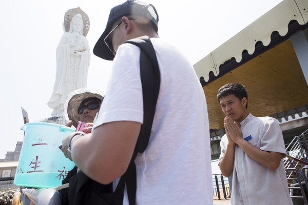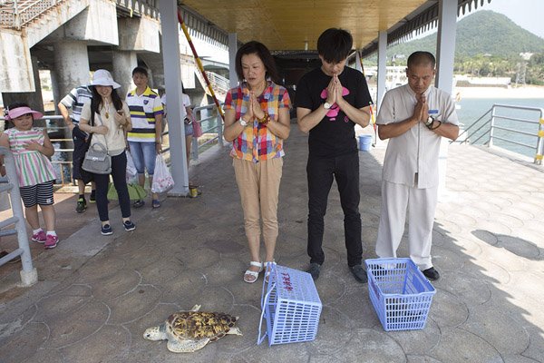诵经完成后,包阿姨和娄先生抱着即将放生的海龟向南海观音拜了三下。小海龟也不安分,包阿姨说,挑中这只小的,就是因为“它虽然小,但是特别凶猛。”