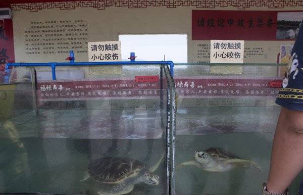 比起能掏得起成千上万放生海龟的少数人,大多数游客路过“南海放生”时只是来参观一下海龟。包阿姨请的两只海龟一直动个不停,大海龟还打翻了筐子爬了出来。