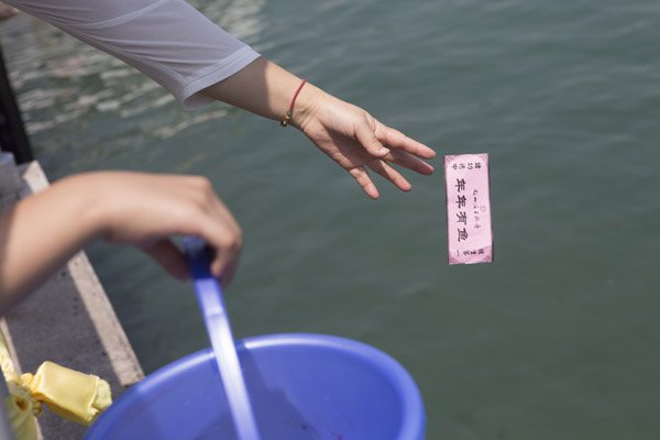 海南三亚的南山文化旅游区内,有一个明码标价的放生点,该放生点内除了放生小鱼,还能放生国家二级保护动物海龟。澎湃新闻调查发现,根据海龟的大小不同,放生价各不相同,最高价可达5万元,让景区游客惊呼消费不起。图为10月2日,一位游客在放生了五条鱼后将粉红色的功德券抛入水中。黄俊如