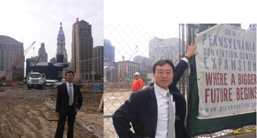 和中公司资深移民专家景霁先生,站在宾州会议中心前,背后的塔尖就是美国宾州费城市的市政厅塔尖。2008年10月,该项目曾引发争议,甚至爆出所谓“147位美投客户集体拒签”等假新闻,但事实胜于雄辩,案子一直在按部就班地进行中,和中的客户们按期全部获得了I-829条件解除,并于2014年9月11日全额拿回了投资款以及投资收益。