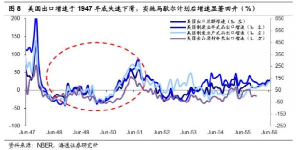 美国制造业产能利用率反弹,产能并未坍缩。以美国钢铁和汽车产业为例,其产能利用率在 1948年后大幅下滑,行业总产能也出现增速大幅放缓的迹象。而在马歇尔计划实施一年后,这两个行业的产能利用率大幅回升,并在计划实施期间维持在较高水平,行业总产能也出现加速扩张的迹象。虽然计划结束后产能利用率再次下滑,行业总产能也不断收缩,但马歇尔计划的实施在一定程度上延缓了产能利用率的失速下滑,行业总产能也并未迅速坍缩,而是台阶式下行,较为平缓。