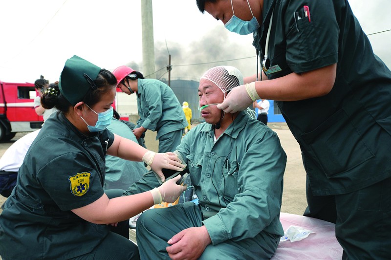 事故发生后,车间主任也在此时迅速跑回现场,站在安全处大声指挥现场处置。几分钟后,消防车到达现场,派出火情侦察人员,现场操作工迎上前介绍情况。消防指挥员向队员下达灭火行动命令。随后,120也赶到了现场。
