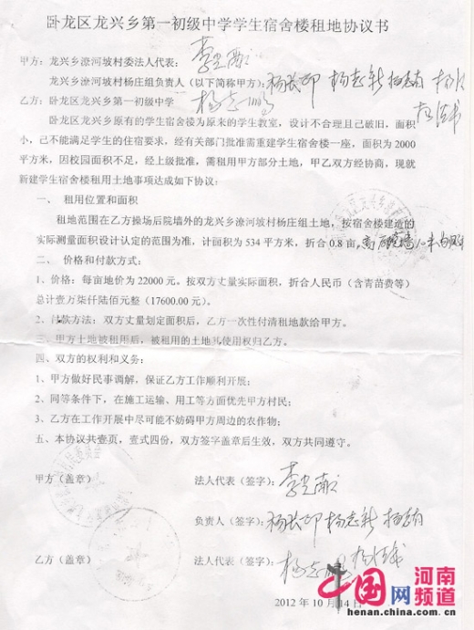 “学校现在建宿舍楼的地方,是租用杨庄组的土地,因为办理征地手续太繁琐,就和村、组签定了一个租赁协议,协议上虽然没有写明租赁年限,但是我们口头上说过是70年,0.8亩地给了村里17600元,这个价钱在我们当地也不少了,但是有些群众还是嫌少”,杨校长对记者说。
